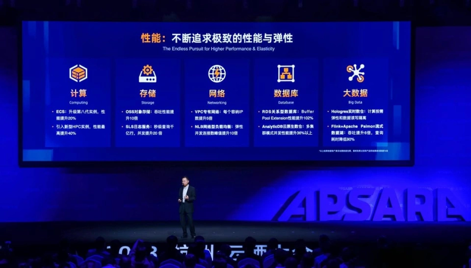 随着自研飞天操作系统的不断进化,阿里云多款基础云产品性能得到大幅升级,例如阿里云最新的第八代ECS实例和HPC新型实例,性能分别提升20%和40%;OSS对象存储读取带宽则提升10倍至100 Gbps,有效加速大模型相关计算和数据分析;RDS数据库读写性能提升了102%……