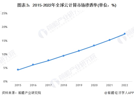 根据Gartner统计,2015-2022年,全球云计算市场渗透率逐年上升,由4.3%上升17.5%。可见,随着世界互联网飞速发展,越来越多的企业运用云的技术,企业应用云计算成为大势所趋。